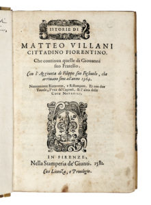 VILLANI Matteo, Istorie di Matteo Villani [...] che continua quelle di Giovanni suo Fratello. — Con l'aggiunta di Filippo suo figliuolo, che arrivano fino all'anno 1364... — Firenze : Nella stamperia de' Giunti, 1581. —