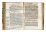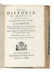 LEGATO CON : Id., Della historia di Matteo Villani [...]. Li tre ultimi libri. In Firenze : Nella stamperia de' Giunti, 1596. Pagine [16], 190 [i.e. 194], [14]. Marca giuntina al frontespizio, ripetuta in fine ; testatine, capilettera e finalini xilografici. Legatura settecentesca in piena pergamena rigida con titoli impressi in oro su tassello al dorso. Una nota al verso della sguardia avverte : "N.B. Le Note marginali sono di mano dell'Abate Anton Maria Salvini". (1) Non comune e stimata edizione.