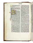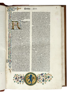 Secondo volume con incipit splendidamente decorato da grande "R" miniata in foglia d'oro e con decorazione a "bianchi girari" con dettagli in rosso e verde e bordi blu che si estende lungo il margine interno ; al margine inferiore, grande cerchio in foglia d'oro con al centro leone rampante in blu, incorniciato da corona d'alloro e con finissima decorazione floreale policroma che si estende ai lati. Testo in gotico su due colonne.