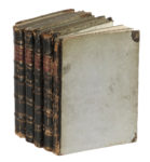 Legatura uniforme coeva in mezza pelle e angoli con tasselli in marocchino rosso e decorazioni dorate ai dorsi (sciupata, con sbucciature e piccole mancanze, piatti rivestiti in carta grigia muta con sbucciature agli angoli e alle estremità).