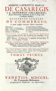 CASAREGI Giuseppe Lorenzo Maria, Discursus legales de commercio, in quibus fusissimè tractantur materiae concernentes assecurationes. Naves, naula, & naulizationes [...] Tomus primus (-quartus). ... — Venetiis : ex typographia Balleoniana, 1740....
