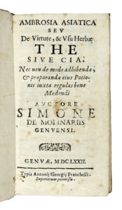 DE MOLINARIIS Simone, Ambrosia asiatica seu de virtute, et vsu herbae the sive cia... — Genuae : typis Antonij Georgij Franchelli, 1672. — In-12° (mm135x68).