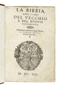 Prima edizione della Bibbia Protestante in italiano, tradotta dall'ebraico e dal greco, nonché commentata da Giovanni Diodati. Questa prima edizione è rarissima e preziosa, essendo pochi gli esemplari giunti integri fino ai nostri giorni, anche perché fu duramente avversata nei secoli dai cattolici.