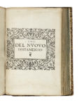 Assenti le 178 pp. dei Libri apocrifi. Grande marca tipografica xilografica al frontespizio, testo su due colonne, testatine, capilettera e finalini xilografici. Frontespizio con piccola mancanza all'angolo superiore esterno e un po' gualcito, strappo parzialmente restaurato alle pp. 11-12, minimo lavoro di tarlo al margine inferiore (pp. 735 e seguenti), carte uniformemente ingiallite, e altre trascurabili tracce del tempo. Mezza pelle settecentesca, dorso a nervi e con tassello con titolo dorato (un po' sciupato), tagli azzurri. (1)