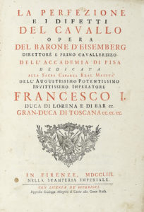 EISENBERG Friedrich Wilhelm (Barone d'), La perfezione e i difetti del cavallo. — In Firenze : Stamp. Imper., Appresso G. Allegrini, 1753. — In-folio (mm 360x240).