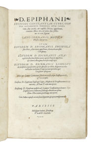 EPIPHANIUS S., Contra octoaginta haereses opus, Pannarium, sive arcula, aut capsula Medica appellatum continens libros tres, & tomos sive sectiones ex toto septem : Iano Cornario [...] interprete. Item, eiusdem [...] ê Epistola sive liber...
