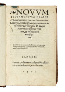 ERASMUS Roterodamus, Novum Testamentvm Graece & Latinè [...] accuratissima cura & diligentia D. Erasmi Roterod. iam denuo & collatum & postrema manu castigatum. — Parisiis, veneunt apud Ioannem Roigny, 1543. — In-8° (mm160x 107).