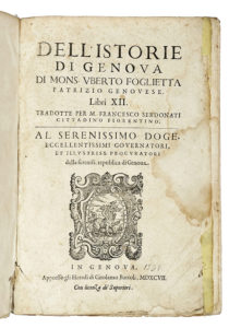 FOGLIETTA Uberto, Dell'istorie di Genoua [...] Libri XII. In Genoua : heredi di Girolamo Bartoli, 1597 — (Al colophon:) In Genoua : per gli heredi di Gerolamo Bartoli, 1596. —