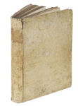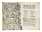 Con un ritratto xilografico a piena pagina del doge genovese Matteo Senarega (con piccola veduta di Genova) al verso del frontespizio della prima opera. Frontespizio con tracce di maldestro restauro e con un pallido alone marginale che prosegue alle carte successive, cerniera anteriore allentata dopo le prime due carte, F3-4 parzialmente staccato, grande alone marginale al fascicolo GG (pp. 349-362), che ricorre più pallido in altre carte successive e si ingrandisce verso la fine. Piena pergamena settecentesca con tassello dorato al dorso (un po' sciupata). (1) Copia completa ma con difetti di questa importante storia di Genova, che menziona la scoperta dell'America al termine del libro undicesimo (pp. 562-563), fissandola però nel 1493, anno notevole per due ragioni : fece così freddo che il mare nel porto di Genova ghiacciò, e in primavera una pestilenza decimò i genovesi ; e poi "fù il Nuovo Mondo ritrovato da Cristofano Colombo cittadino Genovese".