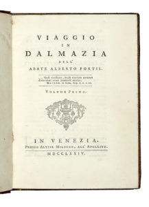 FORTIS Alberto, Viaggio in Dalmazia dell'abate Alberto Fortis. Volume primo (-secondo). — In Venezia : presso Alvise Milocco, all'Apolline, 1774. — 2 volumi in-4° (mm 240x175).