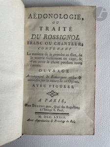 [ARNAULT DE NOBLEVILLE (Louis-Daniel) - SALERNE (François)]. Aëdonologie, ou traité du rossignol franc ou chanteur ; contenant La maniere de le prendre au filet, de le nourrir facilement en cage, & d’en avoir le chant pendant toute l’année....