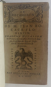 Importante édition considérée par Baudrier comme « un des chefs-d'œuvre de l'imprimerie lyonnaise au XVIe siècle » (IX, p. 248), proposant la version intégrale de la traduction française d'Antoine Le Maçon du « Decameron » de Boccace, dans un petit format in-16. Imprimée par Philippe Rollet, elle est illustrée d'un portrait de Boccace en médaillon au verso du titre, différent de celui de l'édition de 1551, et de 10 vignettes gravées sur bois, placées en tête de chaque journée, attribuables au peintre, dessinateur et brodeur Pierre Eskrich (vers 1520-159.).