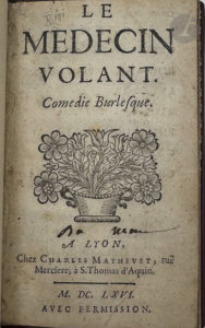 BOURSAULT (Edme). — Le Médecin volant. Comédie Burlesque. — Lyon : Charles Mathevet, 1666. — In-12, veau bordeaux, roulette dorée en encadrement sur les plats, dos à nerfs (reliure du XXe siècle).