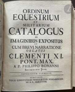 BUONANNI (Filippo). — Ordinum religiosorum in ecclesia militanti catalogus eorumque indumenta in iconibus expressa et oblata Clementi XI. — [Suivi de] : Ordinum equestrium et militarium catalogus in imaginibus expositus et cum brevi narratione...