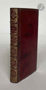 doré en encadrement sur les plats, dos à nerfs, doublures de maroquin rouge ornées d'une roulette dorée en encadrement, tranches dorées sur marbrures (reliure de l'époque).