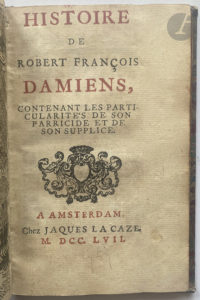 [DAMIENS (Robert François)]. — Histoire de Robert François Damiens, contenant les particularités de son parricide et de son supplice. — Amsterdam : Jacques La Caze, 1757. — In-12, demi-toile brune à la Bradel, dos lisse, tranches rouges...