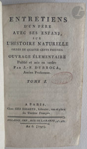 DUBROCA (Jean-François). — Entretiens d'un père avec ses enfans, sur l'histoire naturelle. — Paris : Des Essarts, An 6 (1797). — 5 volumes in-12, basane racinée, dos lisse orné, tranches jaunes mouchetées (reliure de l'époque).