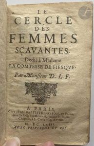 LA FORGE (Jean de). — Le Cercle des femmes sçavantes, Dédié à Madame la comtesse de Fiesque. — Paris : Jean-Baptiste Loyson, 1663. — In-12, parchemin souple, dos lisse (reliure de l'époque).