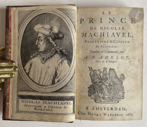 MACHIAVEL — Le Prince. — Traduit & Commenté par A. N. Amelot, Sieur de la Houssaie. — Amsterdam : Henry Wtestein, 1683. — In-12, demi-maroquin bordeaux à coins, filets dorés, dos à nerfs orné, tranches marbrées (reliure du XIXe siècle).
