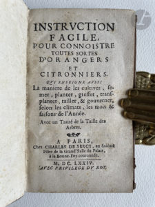 Édition originale très rare de ce précieux traité sur les orangers et les citronniers, arbustes très à la mode à cette époque, suivi d'un autre traité sur la taille des arbres, composés par l'horticulteur Pierre Morin (actif 1650-1690). L'ouvrage fera l'objet de deux autres éditions en 1680 et 1692.