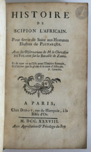 [SERAN DE LA TOUR]. — Histoire de Scipion l'Africain. Pour servir de Suite aux Hommes Illustres de Plutarque. — Avec les Observations de M. le Chevalier de Folard sur la Bataille de Zama. — Paris : Didot, 1738. — In-12, maroquin rouge, triple...