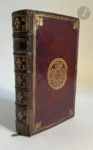 filet doré en encadrement, fleur de lys dorée aux angles et armes dorées au centre sur les plats, dos à nerfs orné de fleurs de lys dorées, roulette dorée intérieure, tranches dorées (reliure de l'époque).