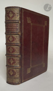 Exemplaire de prix, en maroquin de l'époque, remis en 1705 comme premier prix de latin à un élève nommé Daniel Mathaeus Langlois du collège royal de la compagnie de Jésus.