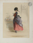 Ensemble des 2 rares lithographies en couleurs qu'Alfred Grévin publia en 1869 pour sa série À travers Paris. Elles représentent 2 parisiennes à la mode, sans doute des courtisanes, devant un restaurant. Elles sont annoncées dans la Bibliographie de la France du 8 mai 1869 sous le numéro 599.