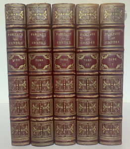 LEGRAND D’AUSSY (Pierre Jean-Baptiste). — Fabliaux ou contes, fables et romans du XIIe et du XIIIe siècle. — Paris : Jules Renouard, 1829. — 5 volumes in-8, demi-maroquin rouge à coins, filets dorés, dos à nerfs orné, tête dorée, non...