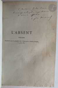- « L'Absent » est un drame représenté pour la première fois sur la scène du Théâtre-Français le 4 juin 1873, avec Sarah Bernhardt dans la distribution, créatrice du rôle de Madame Douglas.