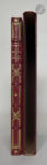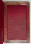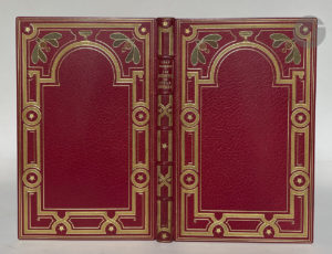 entrelacé sur le bas, brisé par deux cercles de maroquin citron sur les côtés et formant un grand compartiment lobé en haut avec motifs en maroquins verts et marron aux angles, le tout bordé d'un ou de deux filets dorés à l'intérieur et à l'extérieur, et serti de fleurs dorées, dos à nerfs orné dans le même esprit, multiples filets dorés en encadrement à l'intérieur, doublures et gardes de soie moirée rouge, doubles gardes, tranches dorées sur témoins, couverture et dos conservés, étui (Marius Magnin).