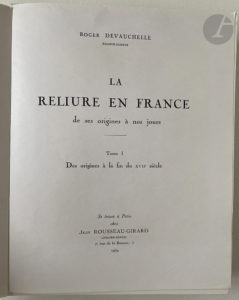 DEVAUCHELLE (Roger). — La Reliure en France de ses origines à nos jours. — Paris : Jean Rousseau-Girard, 1959-1961. — 3 volumes in-4, en feuilles, couverture rempliée, étui.