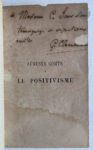 - MILL (John Stuart). Auguste Comte et le positivisme. Traduit de l'anglais par M. le Dr G. Clémenceau. Paris : Germer Baillière ; Londres : Hipp. Baillière ; New-York : Baillière Brothers, 1868. — In-18, demi-basane marbrée, dos à nerfs orné, tranches mouchetées (reliure du XXe siècle). Édition originale de la traduction de Georges Clémenceau. Exemplaire enrichi d'un envoi autographe signé de Clémenceau à Mme Jourdan. Importante mouillure aux deux premiers feuillets. Rousseurs éparses.