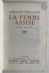 - APOLLINAIRE (Guillaume). La Femme assise. Paris : Nouvelle Revue Française, 1920. — In-16, cartonnage papier marbré à la Bradel, dos lisse, non rogné, couverture et dos conservés (reliure de l'époque). Édition originale. 1/1040 exemplaires sur vélin de Voiron. Usures au dos. Couverture brunie.