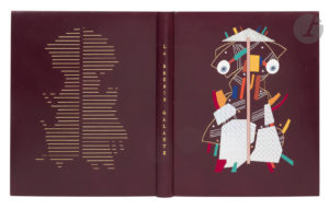 palladium, de petites pastilles de mêmes couleurs, ainsi que de pièces mosaïquées de box rouge, vert, jaune, orange, ocre, blanc, gris et noir, et de papiers brillants et holographiques, second plat orné de filets dorés horizontaux représentant la forme du personnage du premier plat, dos lisse, doublures et gardes de daim gris, tête dorée, non rogné, couverture et dos conservés, chemise à dos et bandes à recouvrement de box bordeaux, étui bordé (M. Richard, 1991).