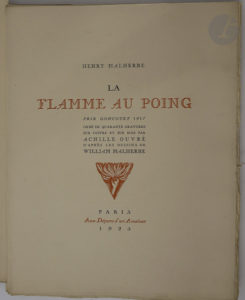MALHERBE (Henry). — La Flamme au poing. Prix Goncourt 1917. — Paris : Aux Dépens d'un Amateur, 1925. — In-4, en feuilles, couverture rempliée, chemise et étui d'éditeur.
