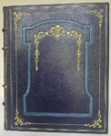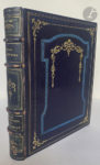 fleuron aux angles et d'un listel droit et bombé de maroquin bleu, guirlande dorée dans le cadre central, dos à nerfs orné, filets et roulette dorés en encadrement à l'intérieur, doublures et gardes de soie moirée bleue, doubles gardes, tête dorée, non rogné, couverture et dos conservés, étui (J. Trinckvel).