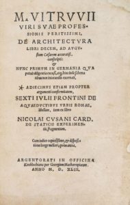 VITRUVE. DE ARCHITECTURA LIBRI DECEM, ad Augustum Cæsarem accuratis conscripti : & nunc primum in Germania qua potuit diligentia excusi… Strasbourg, in officina Knoblochiana per Georgium Machaeropiaum, 1543. In-8 de [52]-260 (1 à 96 et 99 à 262, sans manque)-[52] pages, veau brun, plats avec encadrement à froid, dos à nerfs (reliure pastiche moderne). Première édition imprimée en Allemagne, donnée par Rivius et illustrée dans le texte de 89 CHARMANTES GRAVURES SUR BOIS représentant des girouettes, des cadrans solaires, des radeaux, des moulins, Archimède dans sa baignoire et divers dessins basés sur ceux de l'édition de 1521, mais en format réduit; le texte est entièrement composé en imprimé en italique. Cette édition se termine par "De staticis experimentalis" de Nicolas de Cues et le "De aquaeductibus" de Frontin. Quelques feuillets restaurés aux angles, sans manque. (Fowler 401) (USTC 674607).