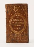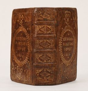 BUSSIERES (Jean de). FLOSCULI HISTORIARUM DELIBATI... Lyon, J. B. Devenet, 1651. 2 parties reliées en un volume petit in-12, dentelle dorée encadrant les plats, médaillon au centre avec inscription Ex dono D. Anthonii Druot 1656, blasons en haut et en bas, dos à nerfs orné, tranches dorées (reliure de l'époque). Les meilleurs élèves du collège de Chalon-sur Saône recevaient des prix   offerts par des bienfaiteurs qui faisaient frapper sur les volumes qu'ils donnaient les armes royales, les armes de la ville accompagnés d'une mention indiquant leur nom et la date de la donation. Celui-ci offert par d'Antoine Druot, capitaine pour le roi des chateaux de Germolle et Montaigu, propriétaire à Mercurey, fournisseur des celliers royaux et sommelier de Louis XIV. Reliure passée. (O.H.R., pl. 1578 et 1051).