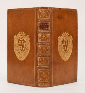BREBEUF. LA PHARSALE DE LUCAIN ou les guerres civiles de César et de Pompée. En vers françois. Paris, Jean Cochart, 1682. In-12, veau blond, filets dorés sur les plats ornés des Armes de la Pompadour, dos à nerfs, tranches rouges (reliure de l'époque). Jolie édition illustrée d'un frontispice et de 10 figures gravées. Précieux exemplaire aux Armes de la Marquise de Pompadour, maîtresse en titre de Louis XV et figurant au catalogue de sa vente de 1765 sous le n° 597. Charnières un peu fendillées avec fines restaurations anciennes. (O.H.R. 2399, fer n°5). Provenance: Marquise de Pompadour.