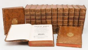 BIBLE DE VENCE - CALMET (Dom Augustin). SAINTE BIBLE EN LATIN ET EN FRANÇOIS, avec des notes littérales, critiques et historiques... Paris, Martin ; Coignard & Boudet ; Mariette ; Guérin, 1748-50. 14 volumes in-4°, veau, plats armoriés, dos à nerfs orné (reliure de l'époque). Edition originale recherchée, la meilleure selon Brunet. Elle est illustrée de 38 cartes et gravures souvent repliées et de 4 tableaux. Nombreuses traces d'épidermure sur les plats avec manques sur plusieurs tomes, coiffes manquantes, une carte effrangée avec manque. Provenance: Exemplaire aux armes de La Carre de Saumery, famille béarnaise (OHR, pl, 1797).