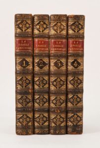 RESTIF DE LA BRETONNE. LA FAMILLE VERTUEUSE. Lettres traduites de l'anglais. Paris, Veuve Duchesne, 1767. 4 volumes in-12 de 35-[1]-251; 288; 300; 299-[13] pages, demi basane à coins, dos à nerfs orné, tranches rouges (reliure légèr. postérieur). CE ROMAN EST LE PREMIER QUE RESTIF AIT COMPOSE ET PUBLIE; il mit longtemps à l'écrire et nous raconte comment, prote chez Quillau, il devint romancier et comment il réunit les éléments de son premier ouvrage. Il n'a jamais été réimprimé, ni contrefait et eut un tirage limité, ce qui est rare pour cette époque. Qq rousseurs et taches, 2 pages tachées. (Lacroix, p. 77) (Rives-Childs, p. 197). Provenances: Jean Sam Ekmanson, éditeur (signature datée de 1780) - Christ. Eichhorn (avec ex-libris) - Stel. et Mart. Vennersten (ex-libris moderne).