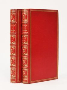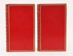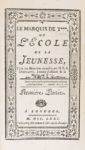 RESTIF DE LA BRETONNE. LE MARQUIS DE T***, OU L'ECOLE DE LA JEUNESSE, Tirée des Mémoires recueillis par N.-E.-A. Desforets, homme-d'affaires de la Maison de T···. Londres. Paris, chez Humblot, 1771. 4 tomes de [8]-5-192-164-200-182 pages, reliés en 2 volumes in-12, maroquin rouge, triple filet doré sur les plats, dos à nerfs très orné, dentelle dorée intérieure, tranches dorées sur marbrure (Belz-Niédrée). Ouvrage rare et très curieux dont chaque partie est consacrée à un chapitre précis: La Jeunesse, L'Amour honnête, Le Mariage et la Conduite des époux. Restif s'adresse ainsi tour à tour aux jeunes hommes, aux jeunes personnes ou aimables filles, aux jeunes citoyens et citoyennes pour leur prêcher les avantages du mariage. Tiré à 1000 exemplaires, l'édition était épuisée à cette époque et l'ouvrage, un des plus rares de l'auteur, n'a jamais été réimprimé » (Lacroix, p. 109). PARFAITE RELIURE DE BELZ-NIEDREE. (Gay III, 70) (Rives-Childs, p. 216). Provenance: Bibliothèque Lucius Wilmerding (ex-libris).