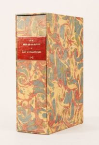 RESTIF DE LA BRETONNE. LES GYNOGRAPHES, ou idées de deux honnêtes-femmes sur un projet de règlement proposé à toute l'Europe pour mettre les femmes à leur place, et opérer le bonheur des deux sexes. La Haie, chés Gosse et Pinet, chés Humblot, 1777. 2 parties en 2 volumes in-8 de [8]-238 et 239 à 567-[1] pages, broché, non rogné, sous chemise et étui cartonné moderne (Lobstein-Laurenchet). Edition originale de ce troisième tome des Idées Singulières avec des notes historiques et justificatives suivies des noms des femmes célèbres recueillis par N.-E. Rétif-de-la-Bretonne, éditeur de l'ouvrage. Restif se mit, à partir du 20 mai 1776, à composer les Gynographes, le troisième tome des «Idées singulières».La première partie de l'ouvrage renferme un projet de réforme des mœurs et des usages du second sexe ; la seconde est une compilation des usages et de toutes les coutumes de la terre relatifs aux femmes... (Rives-Childs). Rousseurs, dos fendus et restaurés, qq. cernes, petit défaut marginal au dernier feuillet, manque de papier en marge de 4 feuillets. Exemplaire entièrement non rogné, tel que sorti de l'imprimerie, condition rare. (Rives-Childs, p. 245) (Lacroix, p. 143).