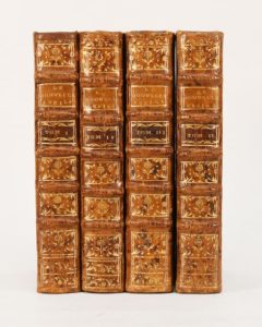 RESTIF DE LA BRETONNE. LE NOUVEL ABEILARD ou Lettres de deux amants qui ne se sont jamais vus. Neuchâtel et Paris, veuve Duchesne, 1778. 4 volumes in-12 de [6]-448-[8]; [4]-464-[16]; [4]-472-[8]-[4]-423-[1]-24-[8] pages, veau marbré, dos à nerfs orné, tranches mouchetées bleues (reliure de l'époque). ÉDITION ORIGINALE. Ce roman est un de ceux que Rétif a imprimé lui-même chez André Caillau, aidant à l'atelier et travaillant même le dimanche. Fier de son roman, il était persuadé qu'il avait composé un livre très utile à la société ayant trouvé le moyen de conserver les mœurs des jeunes gens, et de «faire faire l'amour à la jeunesse sans danger pour ses mœurs»; Mais le principal mérite de cet ouvrage consiste dans les deux contes-bleus qu'il renferme: Le demi-poulet, conte à dormir debout et Les 4 belles et les 4 bêtes. Selon Bordes de Fortage, l'illustration est composée de 10 gravures qui seraient les plus charmantes qu'on trouve dans les œuvres de Restif. Joli exemplaire dans sa reliure de l'époque en veau marbré. (Rives Childs, p. 246)(Lacroix, p.148-151). Provenance: Roger Peyrefitte (Ex-libris).