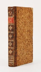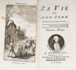 RESTIF DE LA BRETONNE. LA VIE DE MON PERE, par l'auteur du Paysan perverti. Neufchatel, veuve Duchesne, 1779. 2 tomes de [6]-152 et [2]-139-[3] pages reliées en 1 vol. in-12, demi basane, dos lisse (reliure postérieure). Seconde édition, parue la même année que l'originale d'un des plus célèbres romans de Restif: elle est ornée de 2 frontispices, 2 portraits médaillons sur les titres représentant le père et la mère de l'auteur) et 12 gravures non signées illustrant des valeurs morales : obéissance, pudeur, compassion, sévérité, naïveté, etc... Reliure usée, rousseurs. (Rives-Childs, p. 249).