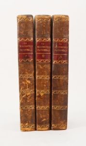 RESTIF DE LA BRETONNE. LA MALEDICTION PATERNELLE : Lettres sincères & véritables de N******, à ses Parens, ses Amis, & ses Maitresses ; avec les Réponses : Recueillies & publiées par Timothée Joly, son Exécuteur testamentaire. Imprimé à Leipsick, par Buschel & se trouve à Paris, chès la Veuve Duchesne, 1780. 3 parties reliées en 3 volumes in-12 de 830-[10] pages, demi-basane, dos lisse orné (reliure légèr. postérieure). Même édition que le numéro précédent. Déchirure sans manque page 203 et taches bleues sur le dernier feuillet du tome 1.
