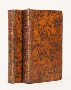 RESTIF DE LA BRETONNE. LA PREVENTION NATIONALE, Action adaptée à la Scène ; Avec deux Variantes, ét les Faits qui lui servent de base. La Haye, Paris, chés Regnault, 1784. 3 tomes en 2 volumes in-12, 292 (mal chiffr. 302)-455-[8] pages, veau brun granité, dos lisse orné (reliure de l'époque). Édition originale illustrée de 10 gravures. Cet ouvrage doit figurer dans une bibliothèque d'histoire. On y trouve le récit du beau trait du chevalier d'Assas, avec une gravure, mais aussi une notice sur Jeanne d'Arc également ornée d'une gravure très curieuse (Tome III, p.145). Il s'agit d'une adaptation partielle de son roman épistolaire paru en 1779 sous le titre La Malédiction paternelle. Les 8 dernières pages renferment une analyse de la «Dernière aventure d'un homme de 45 ans». (Rives Childs, p. 284-285) (Lacroix, p. 215).