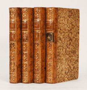 RESTIF DE LA BRETONNE. LES VEILLEES DU MARAIS ; ou Histoire du grand Prince Oribeau, Roi de Mommonie, au pays d'Evinland ; de la vertueuse Princesse Oribelle, de Lagenie : Tirée des Anciénnes-Annales-Irlandaises, recenment-translatée en-français : Par Nichols Donneraill, du Comté de Korke, Descendant de l'Auteur. Imprimé à Wateford, Capitale de Mommonie, 1785. 4 parties en 4 volumes in-12 de 236; 237-496; 268-556 -2 pages, demi veau, dos lisse orné, tranches rouges (reliure postérieure). ÉDITION ORIGINALE très rare de ce roman à clé où l'on trouve plusieurs petits tableaux réalistes et scènes de rues parisiennes; il fut un de ceux que l'auteur eut le plus de mal à faire approuver par la censure en raison des malicieuses allusions qui n'épargnaient pas la famille royale. Restif en conviendra plus tard lorsqu'il fera cette révélation dans Mes Ouvrages : «Les noms sont anagrammatisés dans cet ouvrage : car il faut convenir ici que les allusions à notre famille royale, tant redoutées par Terrasson, étaient vraies…». Interversion d'un feuillet sur deux au dernier cahier du 4ème volume, un feuillet cartonné? (381) a été relié à la fin du tome IV, les observations de 4 pages signalées par Rives-Childs ne sont pas présentes. Agréable exemplaire en reliure de l'époque. (Lacroix, p.237) (Rives Childs, p.286). Provenances: Philippe Louis de Bordes de Fortage (Ex-libris armorié) - Henri Pasquinelly, éditeur (Ex-libris).
