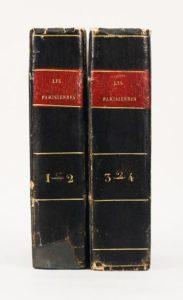 RESTIF DE LA BRETONNE. LES PARISIENNES, ou XL caractères généraux pris dans les mœurs actuelles, propres à servir à l'instruction des Personnes-du-Sexe… Neufchâtel et Paris, Guillot, 1787. 4 tomes in-12 de 300 ; 388 ; 392 ; 380-[4] pages, reliés en 2 forts volumes, cartonnage bleu muet, reliés sur brochure. Edition originale et premier tirage des 20 gravures très fines, non signées et sans légende, placées dans cet exemplaire dans le bon ordre. La page 361 est manquante et la dernière est déchirée avec un gros manque, rousseurs éparses.
